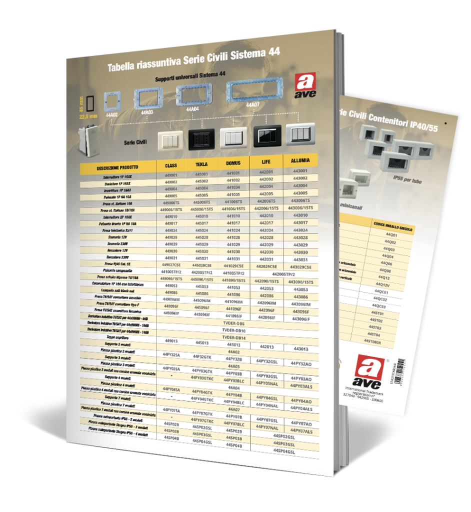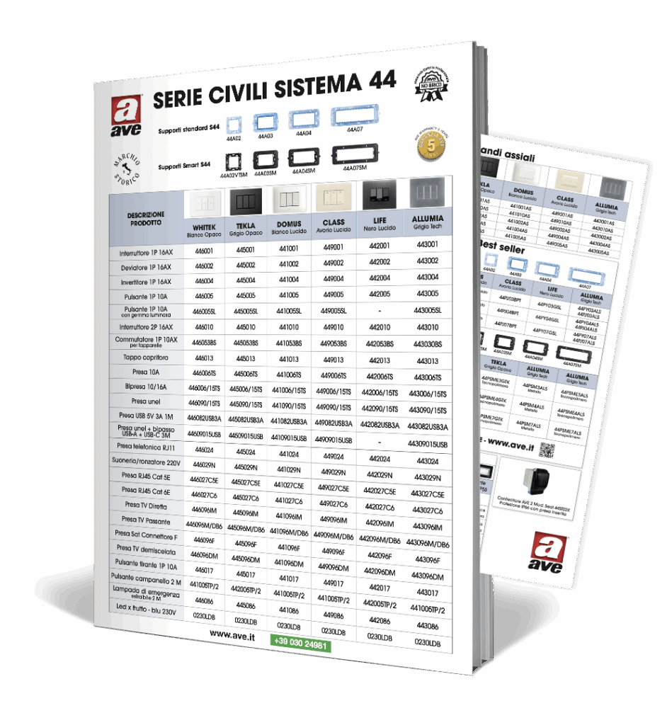 Con il Sistema 44 AVE offre un unico supporto per tutte le placche e le serie civili AVE S44, disponibili in varie colorazioni, tutte complete di comandi, prese, suonerie e soluzioni in grado di rispondere alle varie necessità impiantistiche. L’universalità del supporto permette di offrire un’elevata scalabilità dei costi, combinando al meglio esigenze estetiche e tecnologiche.