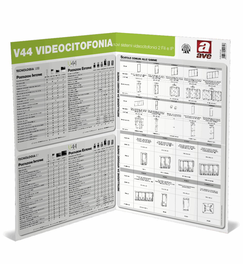 AVE presenta le due gamme videocitofoniche 2 fili (V44 EASY) ed IP (V44 SMART). Entrambe si caratterizzano per il loro design raffinato con struttura bi-materiale in alluminio e vetro. La gamma V44 EASY, grazie al cablaggio con soli 2 fili non polarizzati, consente un’installazione rapida ed a prova di errore. V44 Smart propone un sistema IP completo, che si integra alla domotica e all’antintrusione, offrendo risposte intelligenti per abitazioni ed edifici smart.