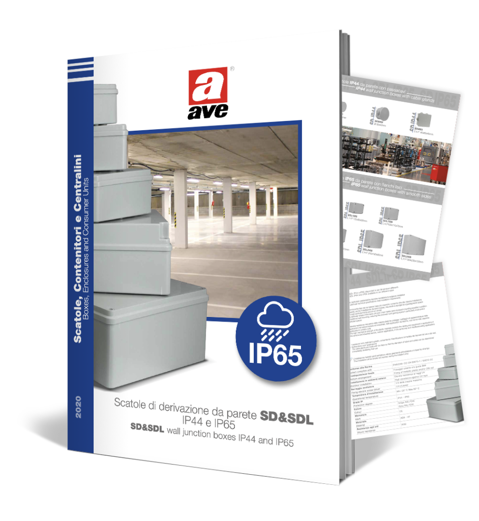 AVE propone una gamma completa di scatole di derivazione da parete SD&SDL con grado di protezione IP44 e IP65. La forma particolare del complesso base più coperchio consente, oltre alla classica installazione da parete, anche l’installazione da semi-incasso riducendo la sporgenza e guadagnando spazio. L’elevata resistenza meccanica delle materie plastiche protegge i cablaggi e le apparecchiature nelle varie applicazioni.