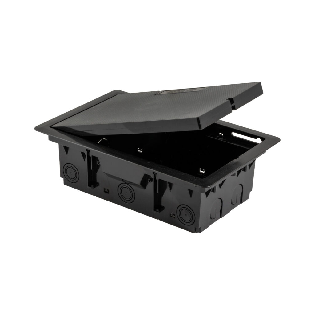 Torretta filo pavimento nera 12 moduli S44 utilizzando due mostrine codice 44MAP6.., 8 moduli S45 utilizzando 2 mostrine codice 445MAR34 e 4 moduli DIN utilizzando 2 mostrine DIN2M. Dimensioni (L H P): 339 x 222 x 102 mm