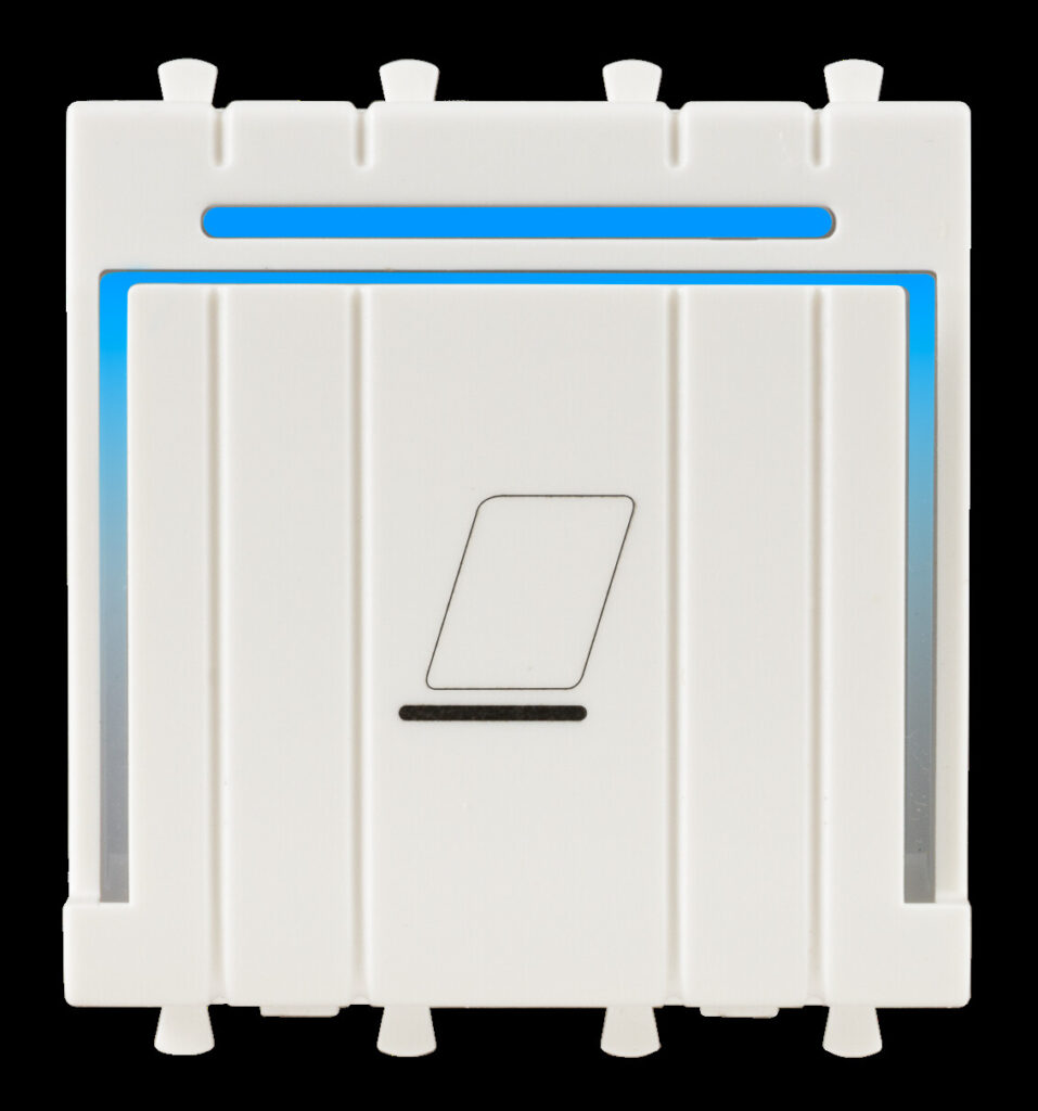 Fornitura di dispositivo tasca portabadge tradizionale tipo AVE 446GA33N. Consente l’attivazione dei carichi e dei servizi di stanza solamente in presenza di una carta all’interno della tasca porta badge. Esso è in grado di gestire autonomamente le proprie uscite ed i propri ingressi in modo da poter funzionare anche in modalità Stand-Alone. Non è in grado di comunicare con altri dispositivi della serie alberghiera in quanto non dispone di linea di comunicazione. É dotato di un uscita a relè a contatto pulito normalmente aperto 250V 16A temporizzata all'estrazione della carta. LED blu di segnalazione al buio con spegnimento a carta inserita. 2 moduli S44 Whitek. Colore bianco opaco "RAL 9010".