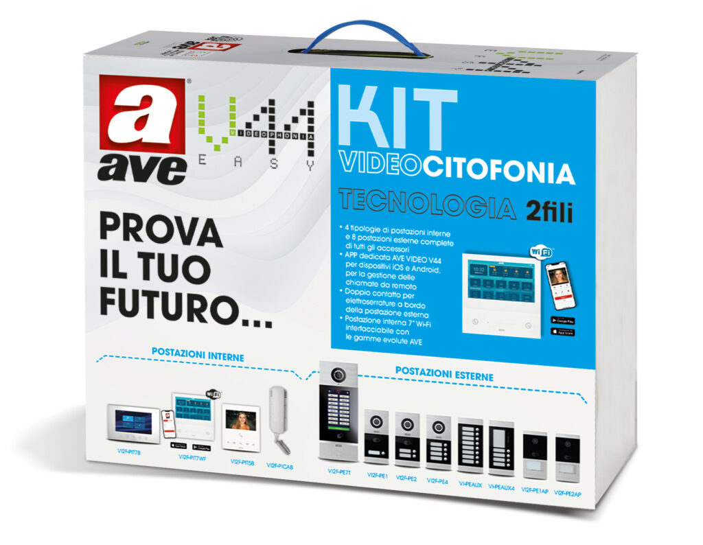 KIT "base scale" Sistema 2 Fili V44 EASY. Il kit contiene: n.1 postazione esterna con display LCD touch screen 7" con lettore MIFARE integrato (art. VI2F-PE7T), n.2 distributori di segnale per postazioni interne (art. VI2F-PIDIST), n.1 alimentatore 1,5A (art. VI2F-ALI), n.1 scatola metallica per incasso in parete (art. VI-BOX5) ed una cornice di supporto per la postazione esterna (art. VI-BOX5C).
