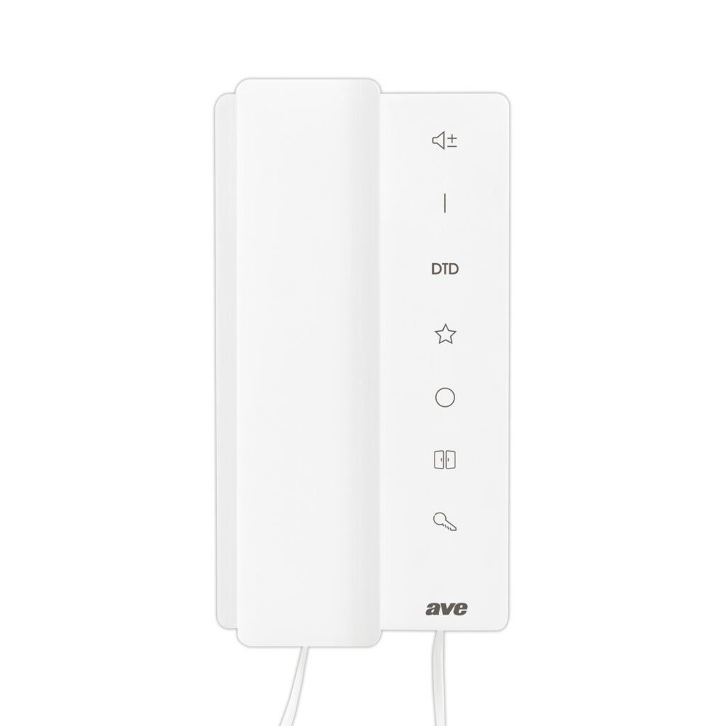 Fornitura di cornetta citofonica per sistema V44 EASY (2 fili) tipo AVE VI2F-PICOR. Gestione n.2 varchi a bordo della postazione esterna e di n.2 contatti su schede relay ausiliari (non fornite a corredo). Funzione mute con inserimento segnalato mediante led; funzione interfono e intercomunicante tra appartamenti diversi. Ingresso per il collegamento del campanello di piano. Installazione su scatole 3 moduli installate veeticalmente. Colore bianco opaco (RAL 9010).
