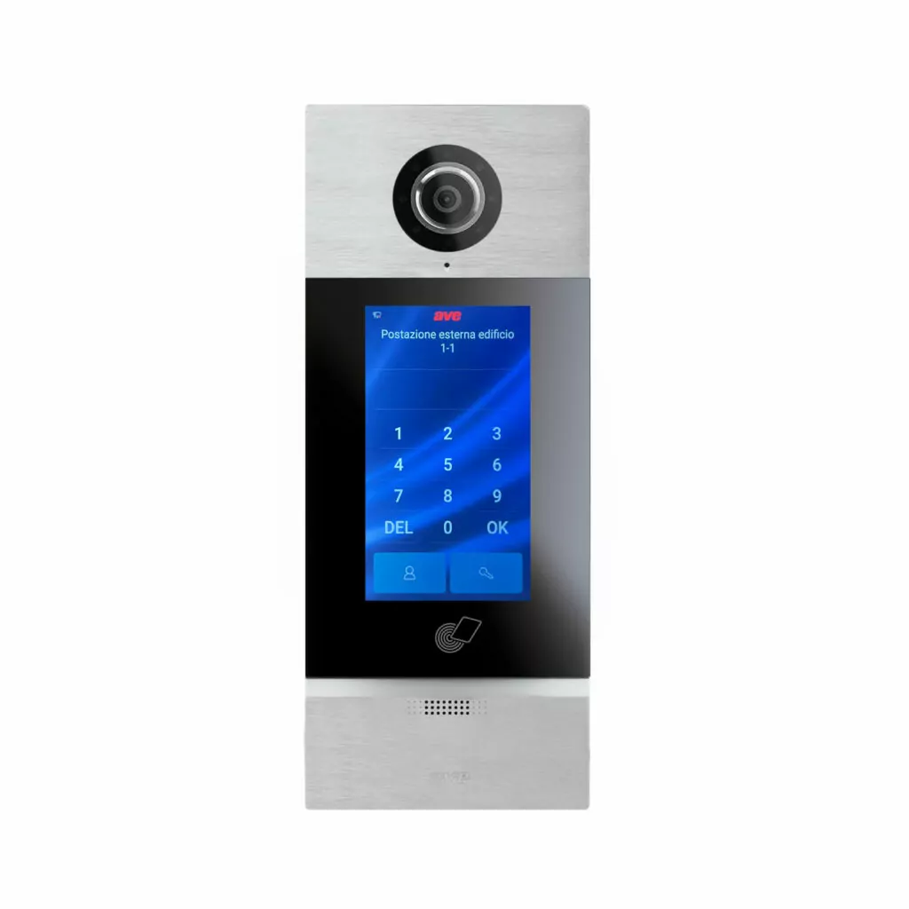 Fornitura di postazione esterna audio-video building per sistema videocitofonico IP tipo AVE VIIP-PE7T realizzata in monoblocco per l’installazione a incasso oppure ad appoggio parete. Alimentazione tramite switch PoE 48Vdc o alimentatore 24Vcc. Display 7” touch screen con possibilità di visualizzazione di una lista utenti a scorrimento delle pagine oppure di una tastiera numerica. N.1 relè di apertura accesso in “potenza” con ingresso per l’installazione di un pulsante ausiliario, n.1 relè di apertura accesso con contatto NA. Ingresso sensore “porta aperta”. Lettore di CARD MIFARE ® integrato. Dimensioni (LxHxP): 148,5x369x49 mm.
